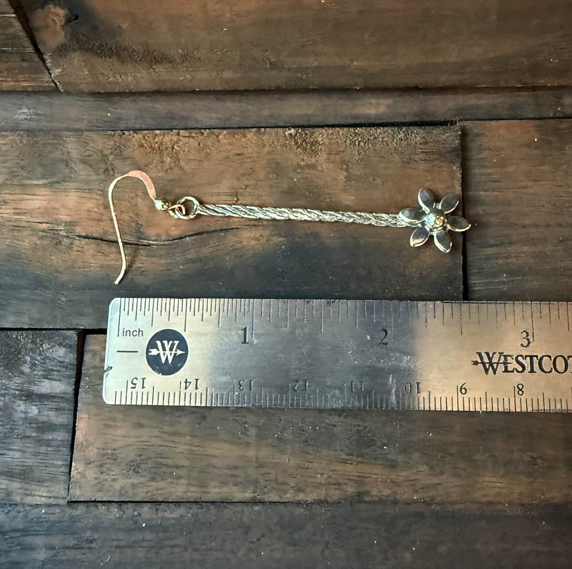 The "braided" part of the earring has been twisted in a drill, flattened using my rollmill, and soldered. It ends into beautiful flowers! This part of earrings are very dangly. They are lovely.