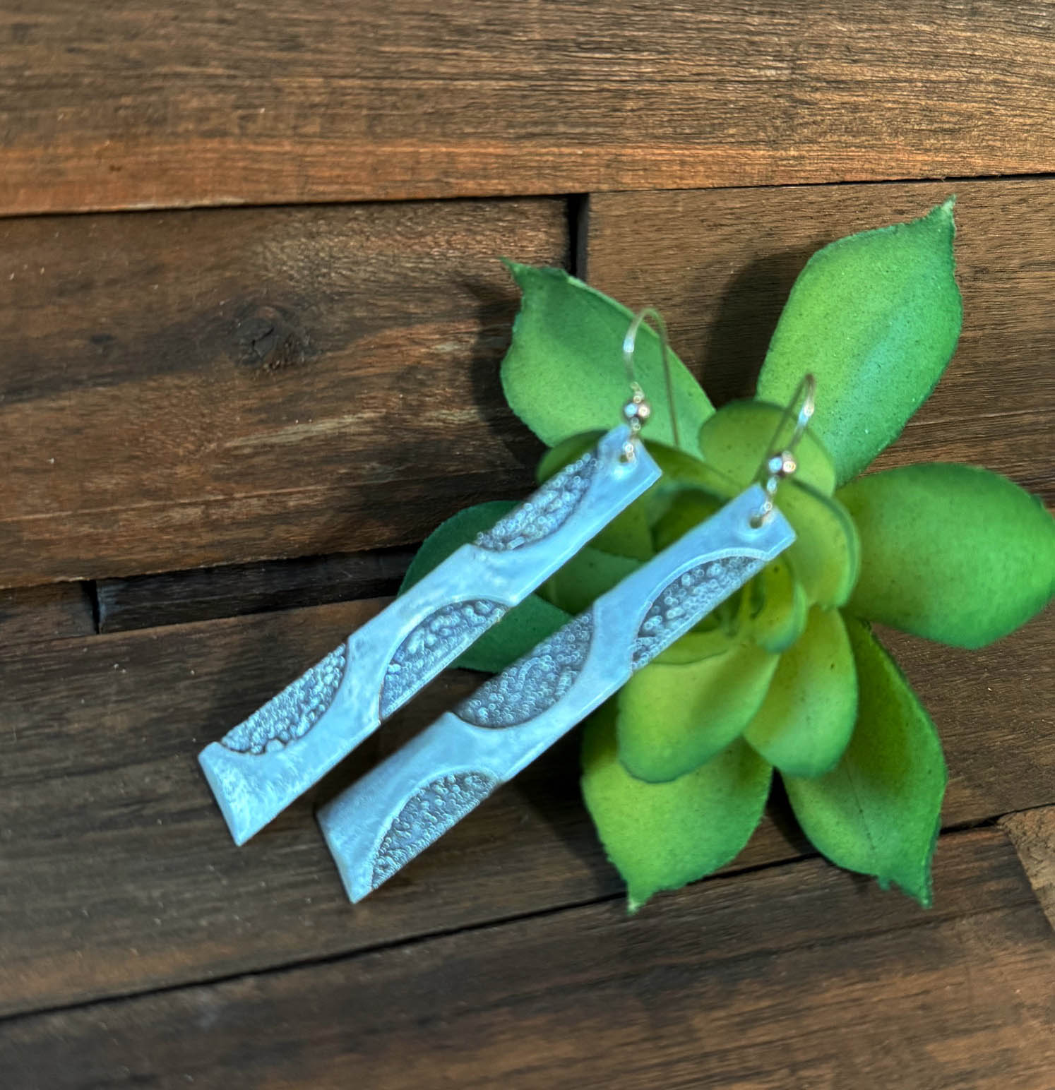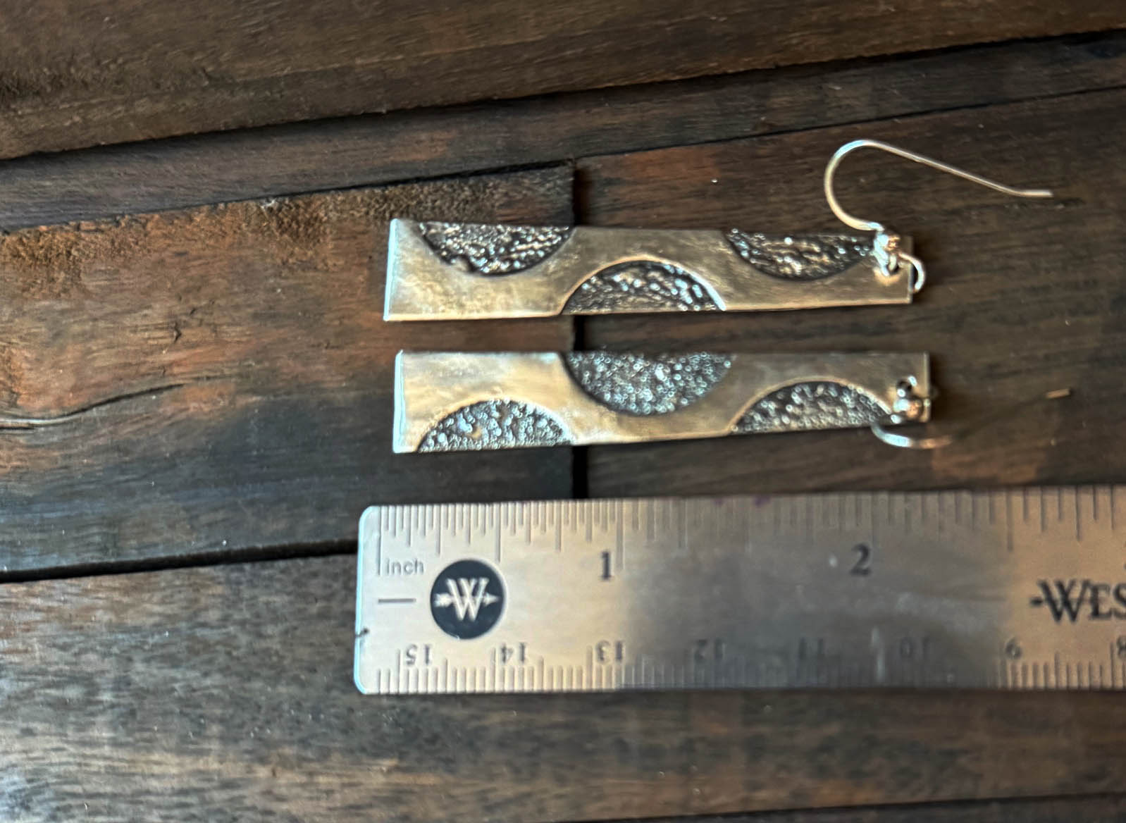 These fun earrings are made from two separate pieces. The blackened material is shaved silver that has been soldered and blackened. They really are statement pieces.